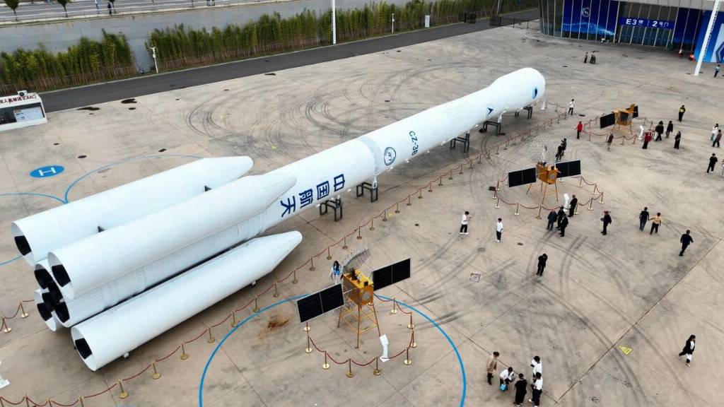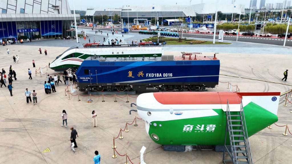 本届峰会上关注度最高的当属大国重器展区。在会展中心的北广场左侧,是“一箭三星”,包括长征三号乙运载火箭模型和三种轨道卫星模型:地球轨道、静止轨道、倾斜同步轨道卫星。广场右侧是“两大列车”+深潜器,包括复兴号动车组模型、复兴型货运电力机车以及“奋斗者”号万米深潜器。
