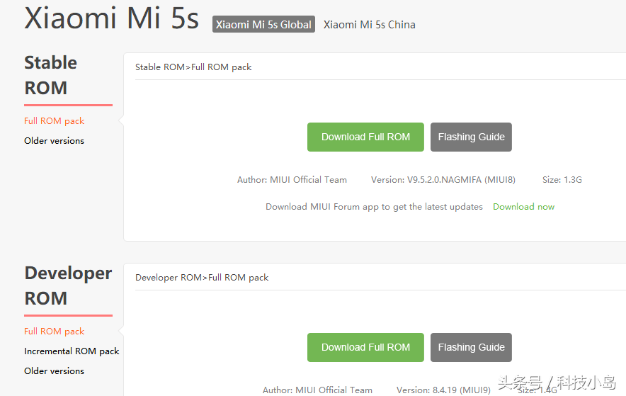 小米5S为例,我下载的是"Xiaomi Mi 5s Latest Global Stable Version Fastboot File Download"最新国际稳定版本。
